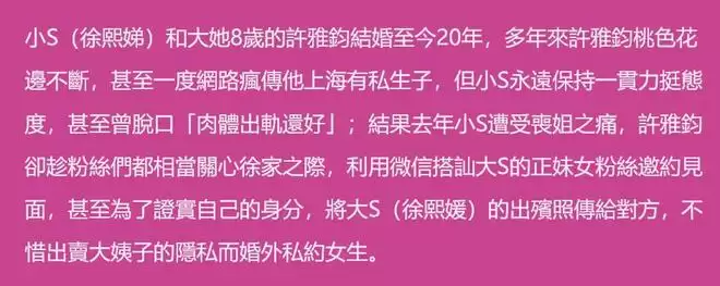 最近台媒难得干了一件明白事,他们曝光小S老公许雅钧的奇葩行径,透露许雅钧主动私聊大S粉丝(女),为了和对方深入聊天,还拿大S出殡照自证身份,整件事离谱到一时之间无人敢信,更离谱的是,台媒没有爆假料。