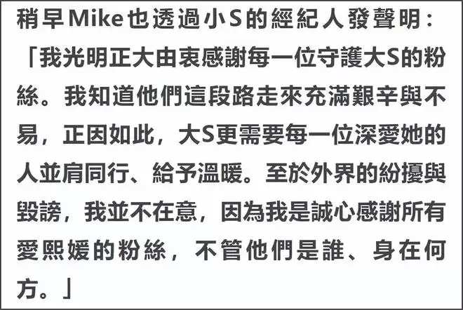 有意思的是,从S妈的回应看,她对小S老公私下行为并不知情,一开始还信誓旦旦否认许雅钧给女粉丝发大S出殡照,得知许雅钧承认之后,才紧急改口,看来S家也不是铁板一块啊。