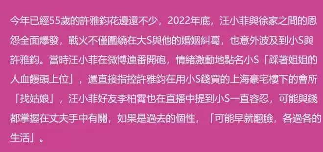 其次注意许雅钧如何辩解自己给女粉发大S出殡照,一整个遇事不决就骂汪小菲,手段娴熟给汪家泼脏水,可见S家对汪家如今只是表面和平,背地里没少针对。