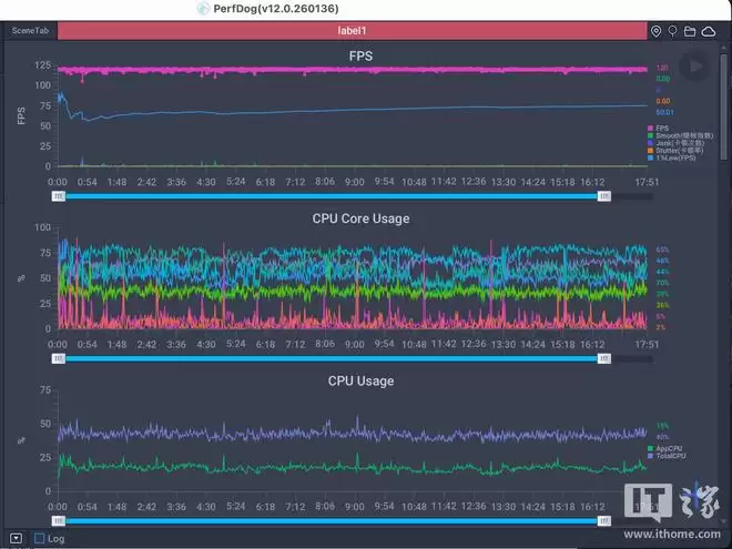 游戏实测部分,IT之家直接使用《三角洲行动》进行检验。画质设为“高”并开启 120 帧,测试地图为“零号大坝”。需要提前说明的是,或许是 PerfDog 尚未完全适配,本次只能通过接线进行测试,因此暂不提供功耗数据参考。