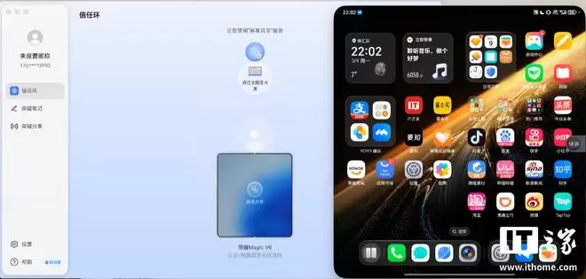 除了同屏的效率,它在跨设备协同上的表现 ——Magic V6 不仅支持全品牌安卓设备的互传,更直接拆掉了“果盘”的围墙 —— 它打通了苹果生态。只需简单操作,能与 iPhone、Mac 等苹果设备实现一碰互传,对于许多不可避免要跨生态办公的双持用户来说,这套无缝衔接的方案简直太友好了。