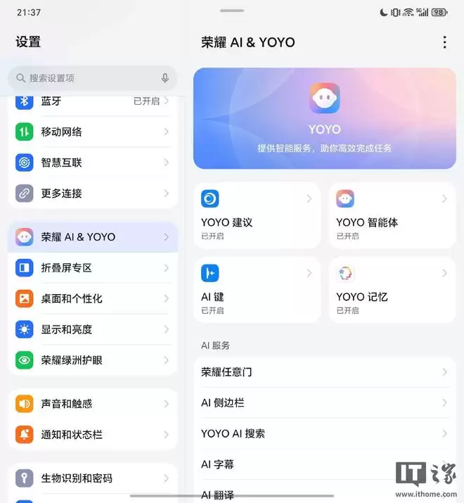 在系统设置中,荣耀专门开辟了一个独立的“AI 专区”,将 YOYO 建议、YOYO 智能体、AI 键以及 YOYO 记忆等核心功能进行了集中管理,层级非常直观。