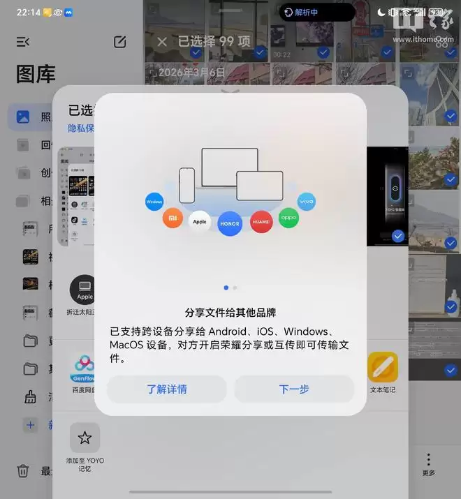 作为行业内首个实现 iOS、Android、HarmonyOS 全系统、全品牌互传的手机厂商,荣耀在跨生态互联方面的含金量,不言而喻。