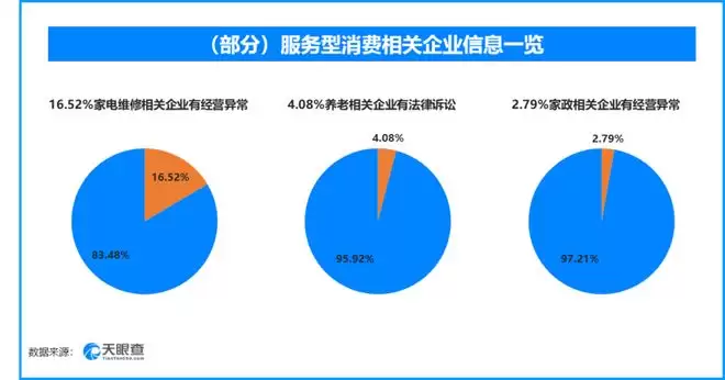 天眼查风险数据显示,从事家电维修相关企业中,16.52%曾出现经营异常,1.46%曾涉及法律诉讼;养老相关企业中,4.08%曾涉及法律诉讼,2.12%曾出现经营异常;家政相关企业中,2.79%曾出现经营异常,2.51%曾涉及法律诉讼。