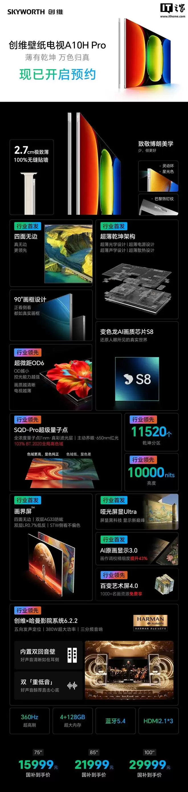 IT之家从创维最新获悉,创维壁纸电视 A10H 系列目前已开启预约(A10H Pro 支持 30 天免费试用),新品核心亮点如下: