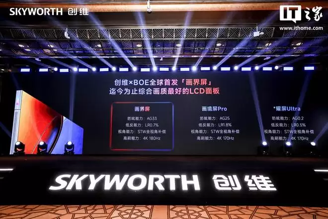 创维还联合京东方 BOE 全球首发「画界屏」,号称迄今为止综合画质最好的 LCD 面板,防眩能力 AG33、低反能力 LR0.7%,支持 STW 全视角补偿能力、4K 180Hz 高刷等特性。