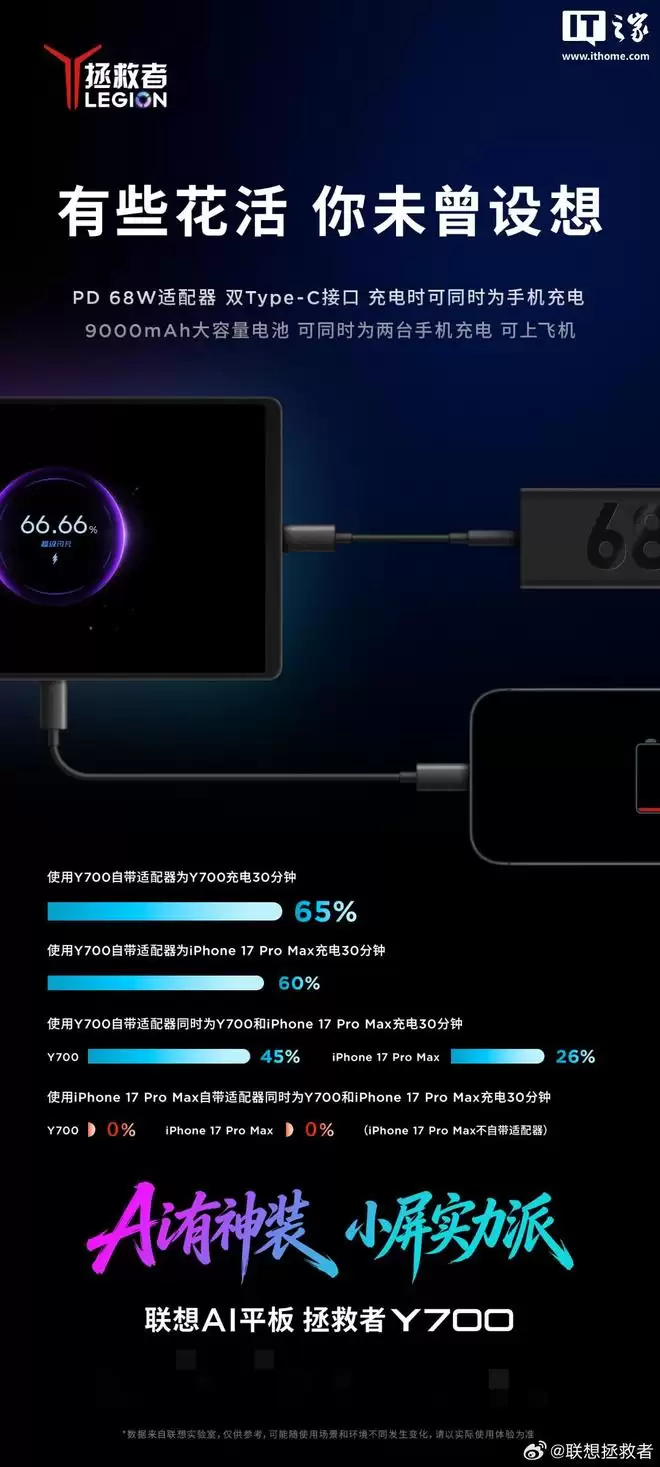 IT之家3月11日消息:联想拯救者今日正式宣布,即将带来“前所未想的花活”——联想AI平板拯救者Y700采用双Type-C接口设计,搭配9000mAh电池,可同时为两台手机充电。