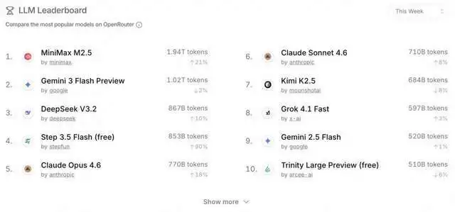 目前OpenClaw的日榜与月榜前三甲被中国大模型Step 3.5 Flash、Kimi K2.5、MiniMax M2.5包揽,“国产龙虾三剑客”格局由此形成,共同展现出中国开源模型的强劲竞争力。不局限于OpenClaw单一APP,Step 3.5 Flash在OpenRouter统计的全球大模型调用量中增速同样明显,过去7天调用量达853B tokens,环比增速90%,与MiniMax M2.5、DeepSeek V3.2一起位居全球前五。