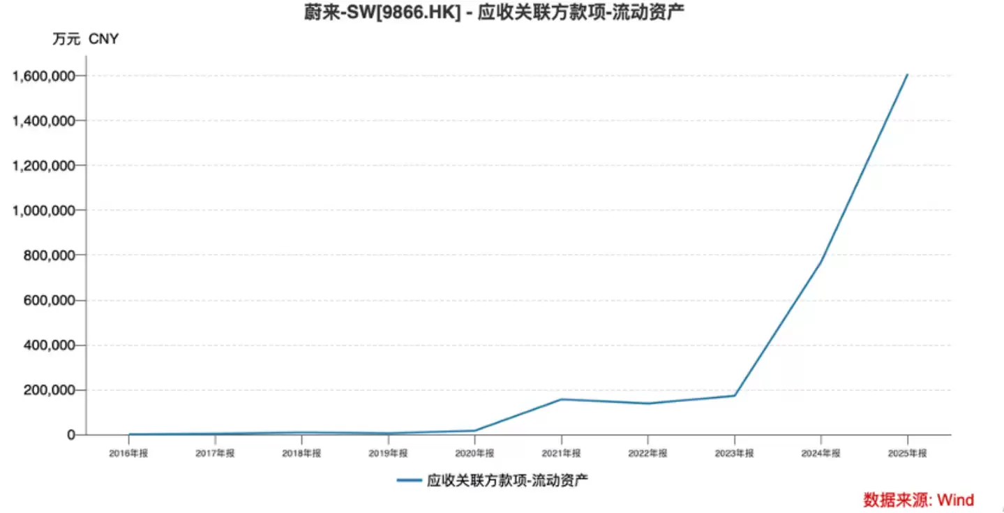 财报中应收关联方款项的构成主要就是蔚来卖给蔚能的电池应收款,可以非常清晰看到2025年之后此数据乃呈现指数级的飙升,我们基本可以确定蔚来大部分已经选择了BaaS购车模式,即购车的时候只购买车身(不包括电池),电池则是通过按月付租金的方式租赁获得,具有购车门槛低,成本低(车险不包括电池部分)的特点,车身和电池分开销售也是蔚来的一大创新了。