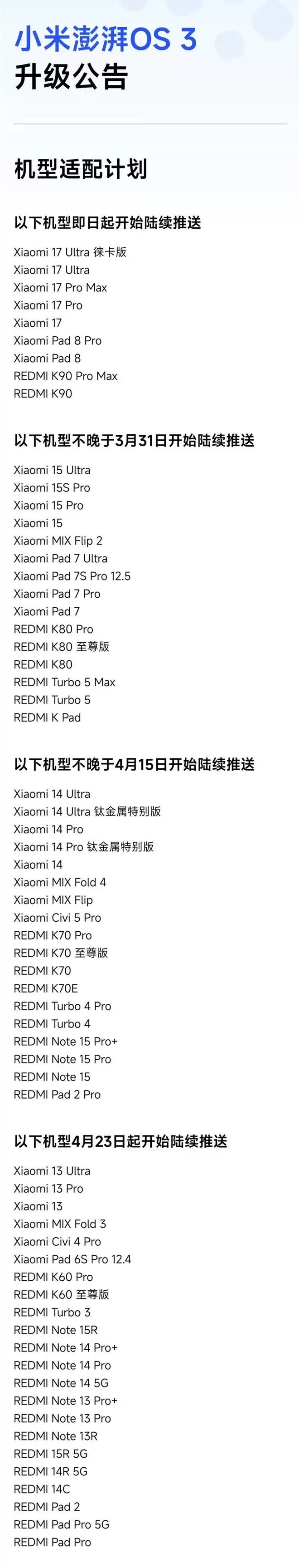 即日起推送的机型是小米17系列、K90系列、Pad 8系列;3月31日前覆盖到15系列和K80系列,4月15日前轮到14系列和K70系列,4月23日之后才是13系列和K60系列这些老将。