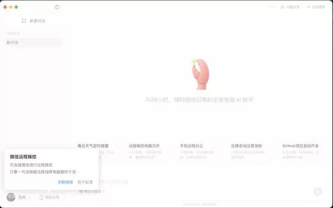 相比原始的开源版本,它最大的变化是去掉了部署门槛:用户只需下载安装软件,就能通过手机微信或 QQ 发送自然语言指令,让 AI 远程操作自己的电脑,完成整理文件、生成报表、自动处理数据等任务。