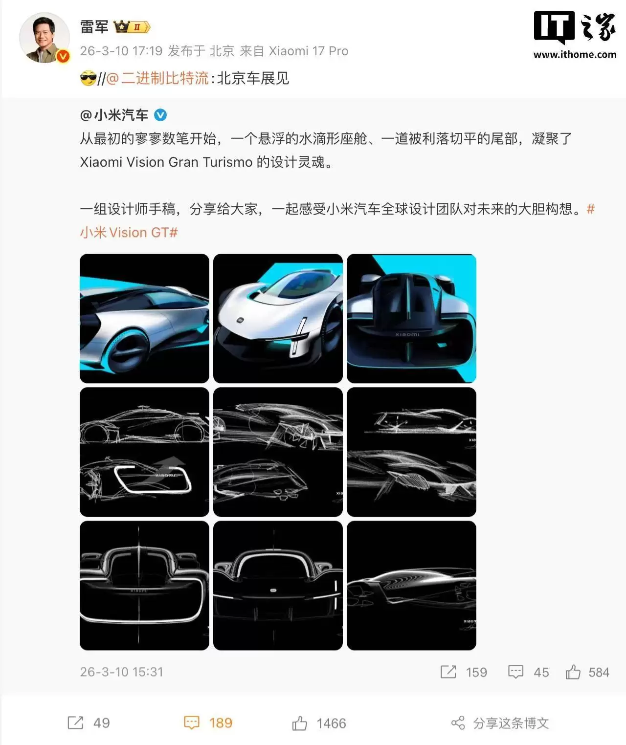 值得一提的是,小米汽车最新已确认,小米Vision Gran Turismo概念车将亮相2026北京车展。届时,广大汽车爱好者将有机会亲眼目睹这款“由风塑形”的车的风采,感受小米在汽车设计领域的创新实力。