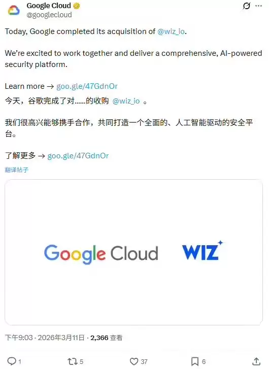 3月11日,谷歌正式宣布已完成对网络安全公司Wiz的320亿美元(约合2200.49亿元人民币)全现金收购交易,Wiz即日起正式加入谷歌云。这是谷歌成立26年以来规模最大的一笔收购,标志着其在云计算与人工智能时代加速安全布局的战略决心。