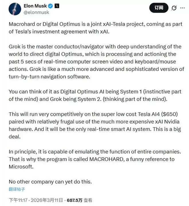 美东时间11日周三,马斯克在旗下社交媒体发帖宣布,特斯拉与他的AI初创公司xAI将联合开发一个名为“Digital Optimus”(数字擎天柱)、又称Macrohard(巨硬)的新AI项目,旨在打造能够自动执行软件任务的AI智能体系统。