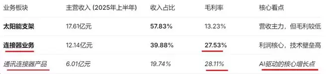 最新收入结构:根据2025年半年报,其业务由“组件”、“连接器”和“系统互连产品”构成,其中组件(包含高速线模组)已成为最主要的收入来源,且毛利率最高。