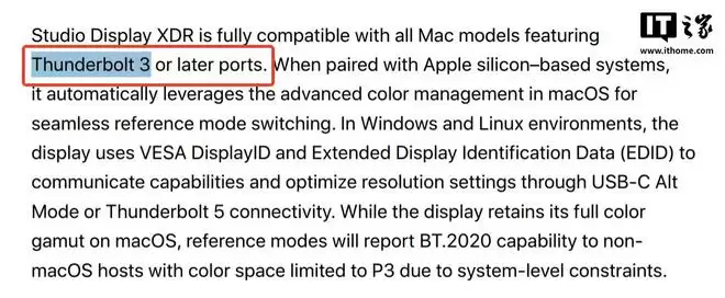 此外苹果最新的技术白皮书也印证了这一点,文件明确指出该显示器“完全兼容所有配备雷电3或更高版本接口的Mac机型”。同时白皮书还说明该设备在Windows和Linux环境下同样支持基础的显示协议识别。