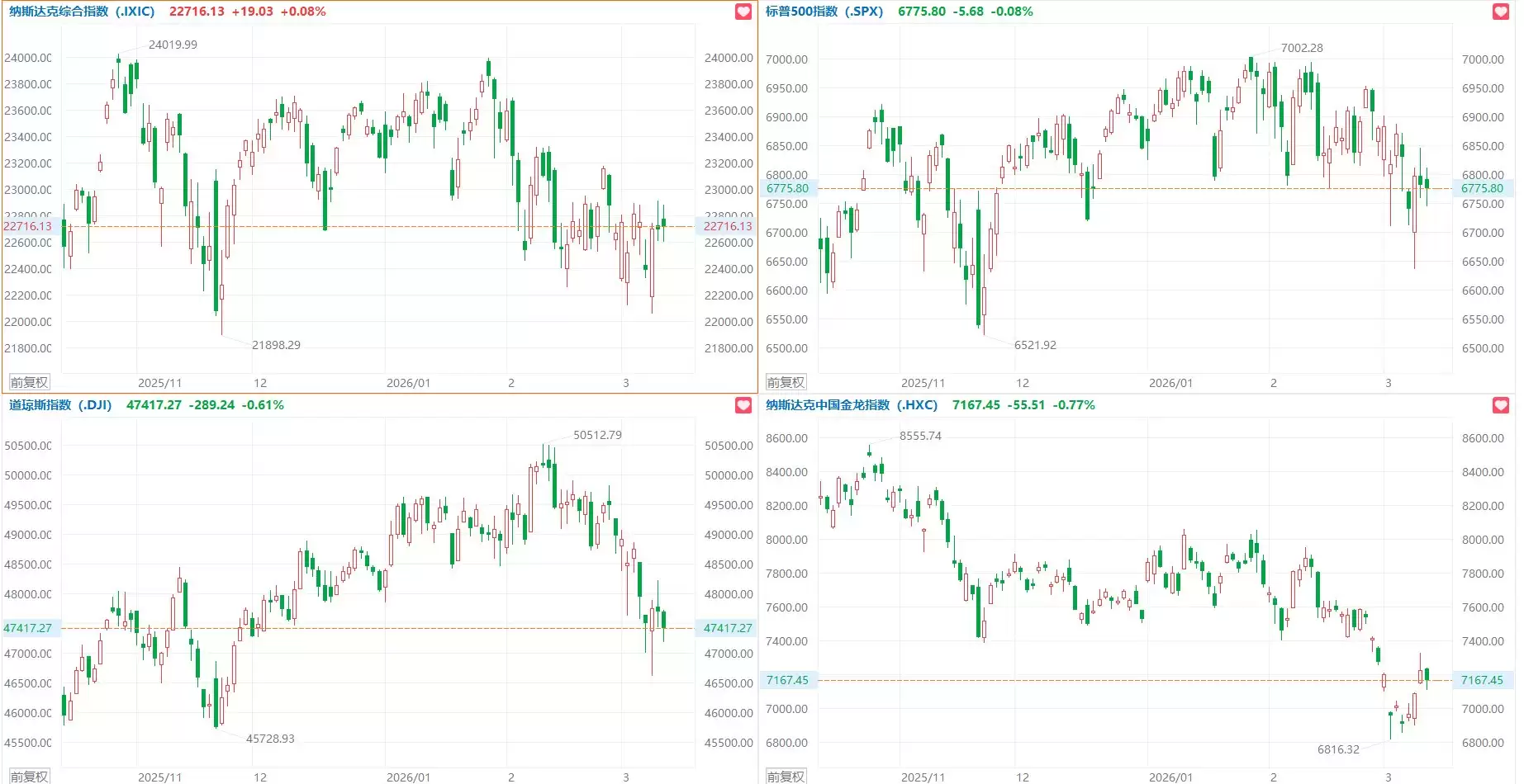 周二公布的美国2月通胀数据基本与市场预期相符,三大股指表现分化。道琼斯工业平均指数收跌0.61%,而纳斯达克综合指数则微涨0.08%,标普500指数小幅下跌0.08%。
