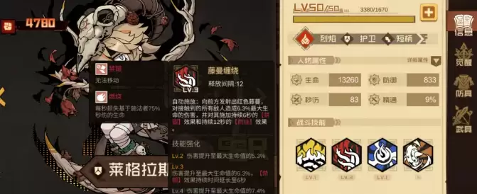 护卫位有两个选择,莱格拉斯和诺儿,针对不同情况各有优势。莱格拉斯的自动技能能挂燃烧,正好补充阵容需要的燃烧状态。大招可以给全队减伤,还能共享生命值,把伤害分摊出去,硬抗能力很强。莱格拉斯适合用来应对需要全队扛伤的关卡,堆生命值和防御力就行,打法简单。