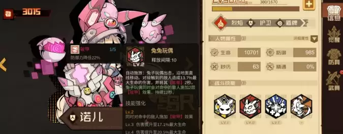 诺儿适合对抗那种集中爆发的BOSS关卡。她的大招有4秒无敌效果,可以直接无伤接住BOSS的高爆发技能,自保能力在护卫里算很突出的。她的自动技能还带破甲,打强力单体BOSS的时候破甲效果很有用。诺儿需要多堆充能速度,方便手动卡时机释放大招来挡关键伤害。