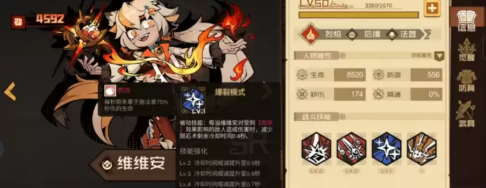 薇薇安在这套阵容里定位是副输出。她的被动可以缩短自动技能的冷却时间,让自动技能的释放频率更高。而她的自动技能爆裂模式,可以给敌人挂上燃烧状态,而且有三段伤害,每段都能触发天罚之日的增益,同时也触发自身被动的减冷却效果。燃烧挂上去之后,沙拉曼的沙暴伤害会更高,两个角色之间的联动就是靠这条线串起来的。