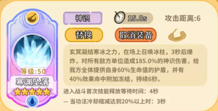 护盾量是寒渊坠落最核心的价值,全队60%生命值的护盾折算下来约37万。菩提锤裸伤大约70万,这个护盾相当于抵挡了近一半的伤害。治疗是治疗,护盾是护盾,两者不能互相替代,但护盾能拉高队伍的一击承受线,后排不容易被突然秒掉,为治疗留出反应时间。附带40%概率触发6秒冻结,触发率不算高,不能当成稳定控制来用。但冻结有个特点,护盾和地藏戍卫阵都挡不住,被冻结的单位行动停止、技能冷却暂停,主要时刻能卡掉对面的治疗或者打断输出节奏,偶尔能起到意想不到的效果。