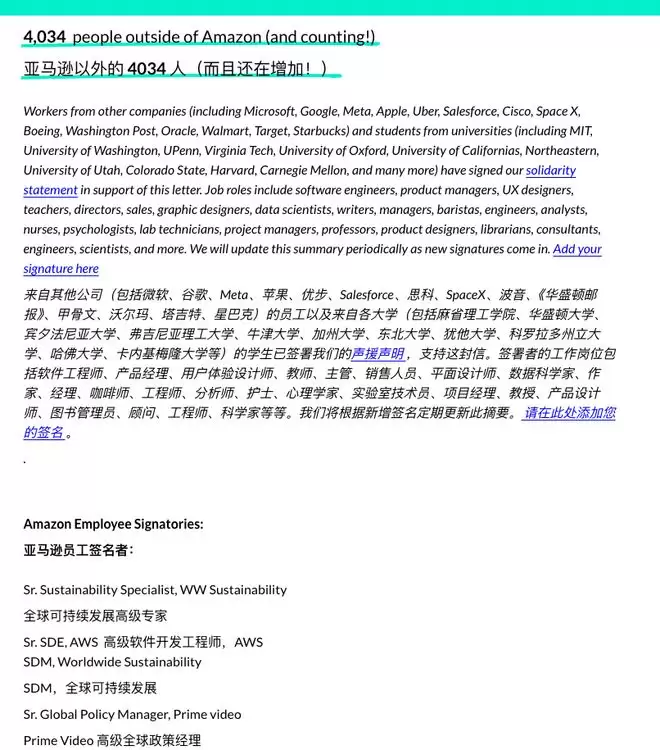 亚马逊的员工们不想坐以待毙,他们发起了联合签名行动,不仅鼓励员工们参与, 也呼吁外部人士加入进来,目前已经有超过四千多人参与。