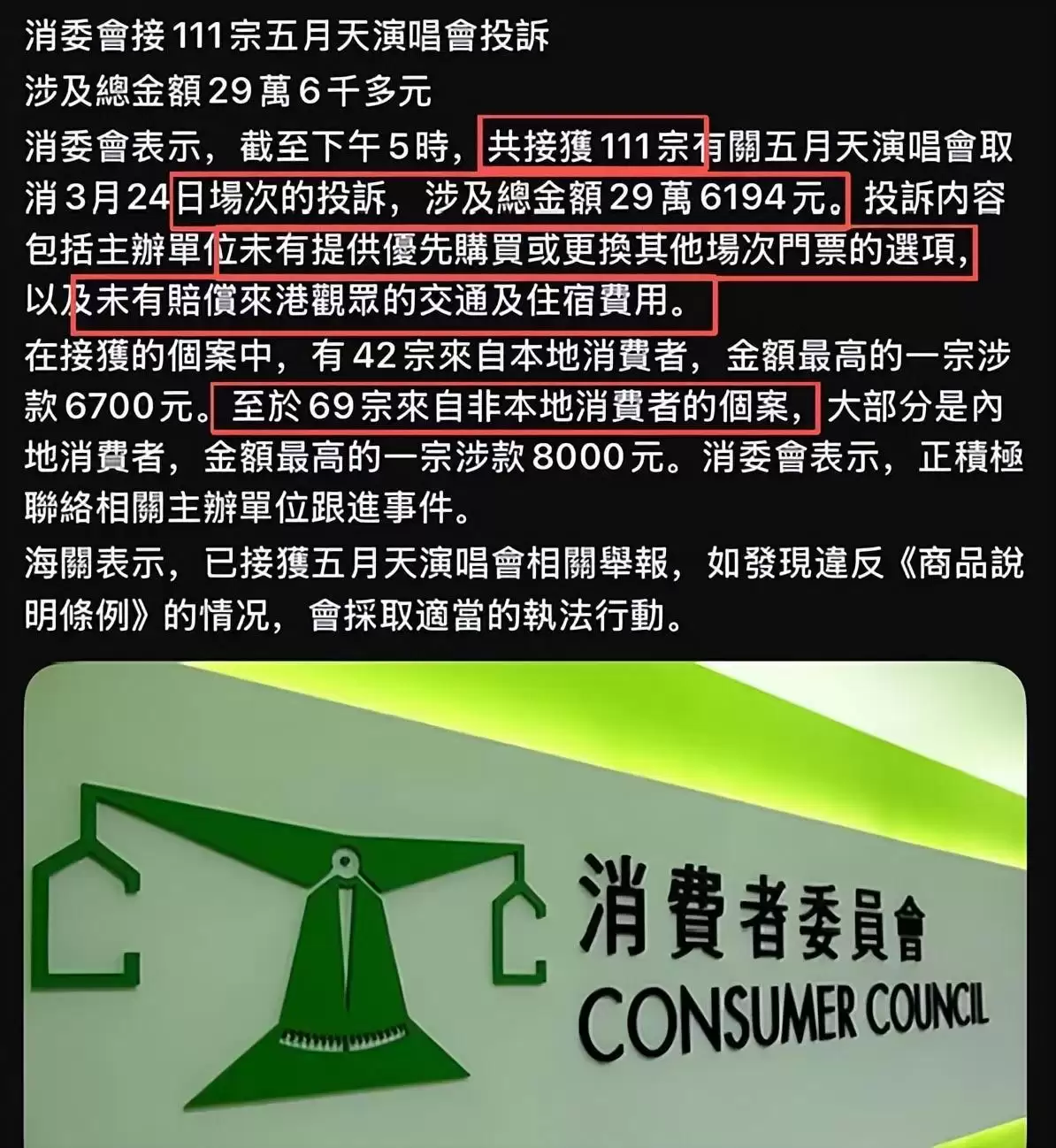根据港媒报道,香港消费者委员会目前已接到一百一十一宗与五月天演唱会相关的投诉,其中本地投诉四十二宗,非本地投诉六十九宗,涉及总金额超过二十九万港元。投诉内容主要集中在两点:一是主办方未提供优先购票或更换其他场次门票的选项;二是主办方未对赴港观众的交通及住宿费用作出赔偿。