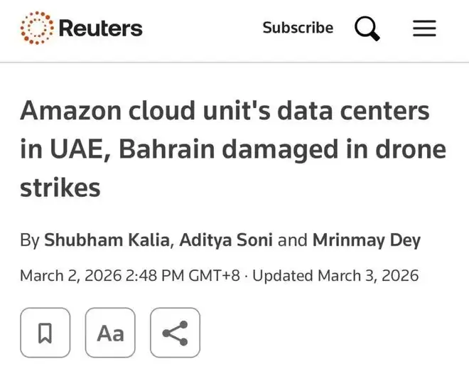 3月1日,亚马逊云服务(AWS)的一纸公告震动了全球科技圈。公告显示,其位于中东的三处数据中心遭无人机精准"点名"。两枚弹药直接贯穿了阿联酋境内的机房顶棚,巴林的设施也没能幸免,在爆炸的余波中陷入死寂。