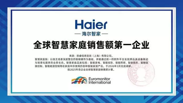 欧睿国际最新数据显示:继家电全球17连冠后,海尔智家又成为全球智慧家庭销售额第一企业。截至2025年底,海尔智慧家庭全球累计注册用户突破1.3亿,全年智慧场景交互总量达861亿次,月均交互71.75亿次。在国内及“一带一路”沿线国家,Hai Smart生态平台拥有1300多万活跃用户、6600多家生态合作方、5500多万台联网设备;在美洲、欧洲、澳洲地区,SmartHQ平台汇聚460多万活跃用户、6500多家生态合作方、2100多万台联网产品。