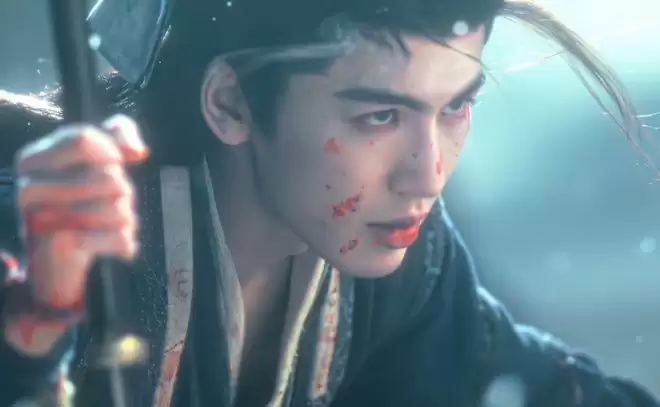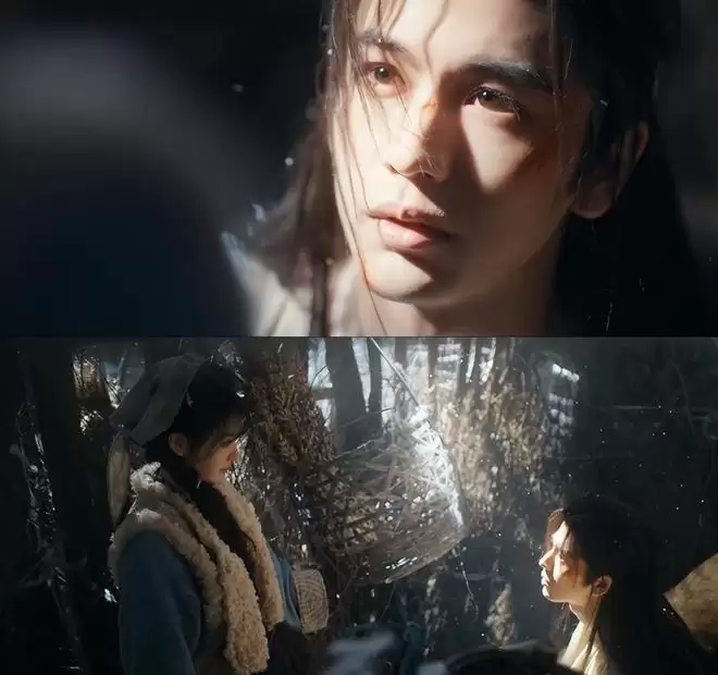 反观在《逐玉》中张凌赫也有摔倒的戏份,满天飞雪,寒光铁衣,男主发丝都被沾染了血气,绝望又悲凉地倒下悬崖,这一幕真是拍得太有氛围感了。