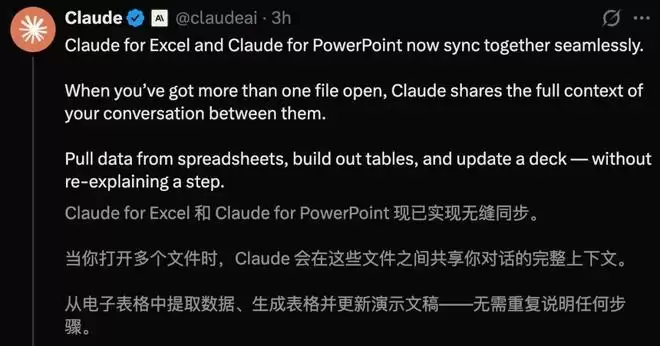 刚刚,Anthropic正式发布Claude for Excel与Claude for PowerPoint的重大更新,核心亮点在于实现了跨文件的全上下文共享。
