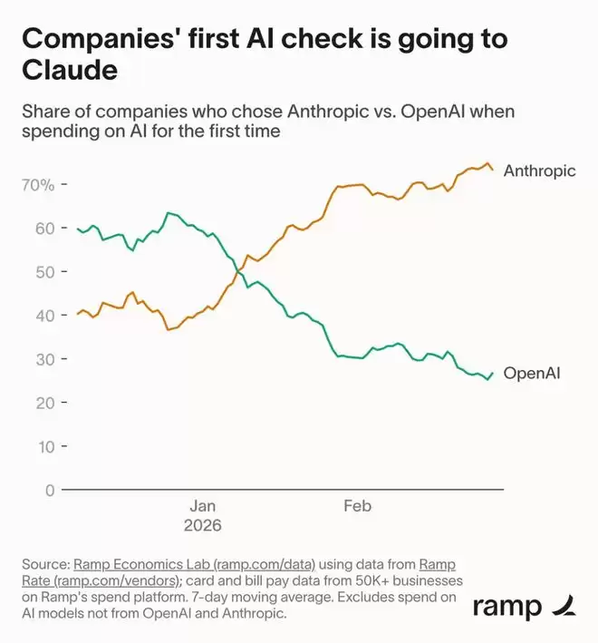 据最新Ramp AI指数显示,Anthropic已超越OpenAI,成为美国企业的首选。