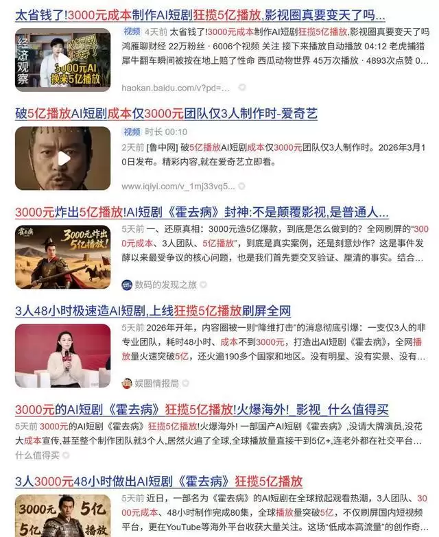 3月6日,有关AI短剧《霍去病》的报道在全网刷屏。报道称,一名90后导演带领3人团队,仅用48小时和不到3000元的成本,便制作出80集、全网播放量破5亿的AI短剧。