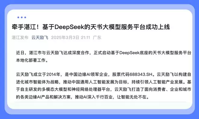 正如前文提到,3月3日,湛江当地最新媒体发文,湛江市与云天励飞达成深度合作,启动基于DeepSeek底座的天书大模型服务平台本地化部署工作。基于国产化技术栈打造的DeepSeek-R1 671B大模型,已于3月1日在湛江政务云平台成功上线运行。