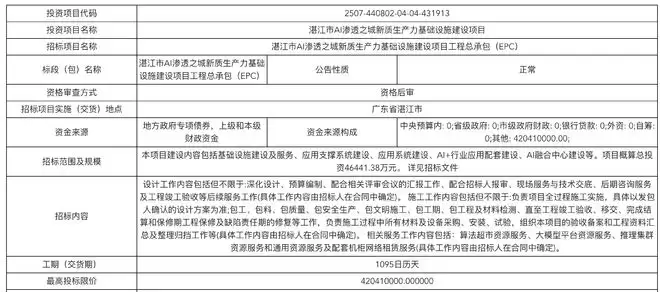湛江市AI渗透之城新质生产力基础设施建设项目工程总承包(EPC)中标公告显示,中标方为中时讯、中通服中睿和云天励飞的联合体,投标报价约4.2亿元。