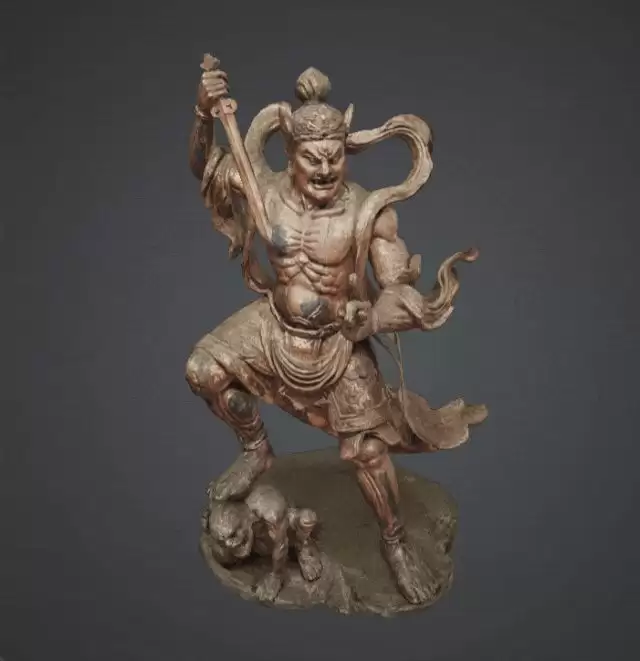 在这个案例中,Tripo P1.0 模型的纹理贴图非常真实,精细地捕捉了木雕或彩塑表面的斑驳感、油漆脱落的痕迹以及木材本身的纹理: