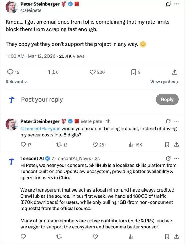 3月12日,OpenClaw创始人Peter Steinberger在社交媒体公开发文“抱怨”腾讯:“只会照搬抄袭,却没有以任何形式提供过支持。”他还@腾讯混元团队并喊话:“你们能不能搭把手帮衬一下,而不是把我的服务器成本硬生生推高到五位数?”