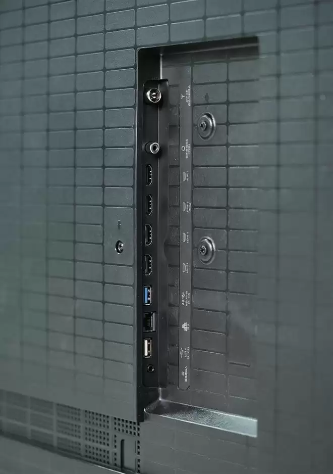 背部右侧有一排I/O接口,从上到下依次是:天线接口、同轴音频接口、3个HDMI 2.1接口(中间的支持eARC)、USB 3.0、有线网口、USB 2.0以及一个音频输入接口。