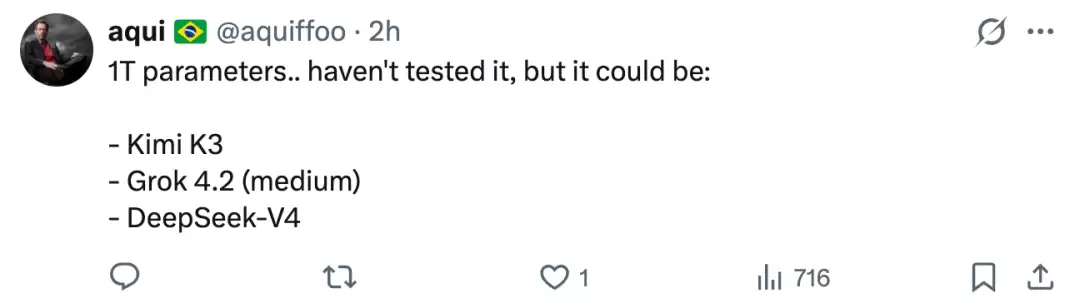 对于1T参数版本的Hunter Alpha,猜测对象就更多了,除了DeepSeek V4,还有Kimi K3、Grok 4.2、Claude以及GPT 5o或5.5 instant。毕竟,这么大的参数量和上下文组合,目前看来只有几家大厂能做到。