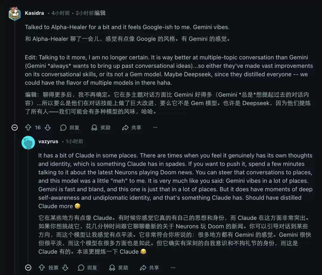 有人从对话风格入手,说Healer Alpha用起来有Gemini那种“Google味”,但也有人说它某些方面像Claude。
