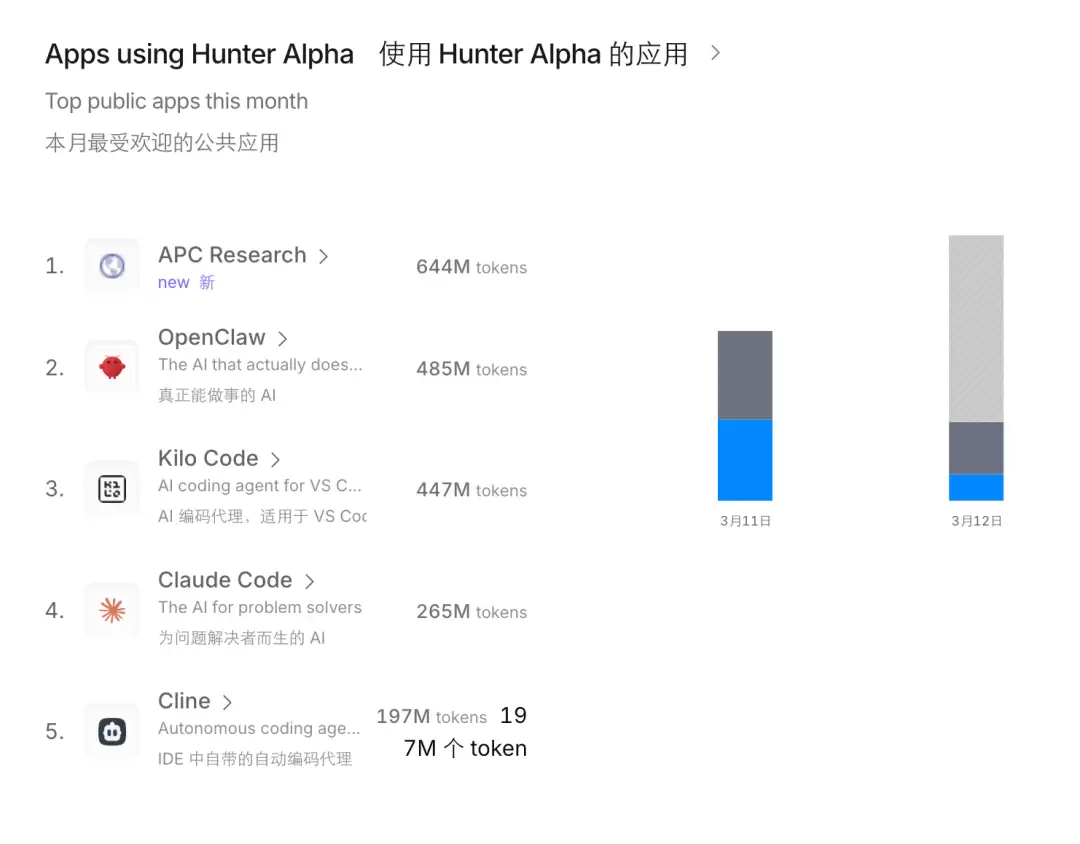 其中,“Hunter Alpha”还专门强调,它具备OpenClaw等“龙虾”框架所需的可靠性和指令遵循精度。OpenRouter的统计也显示,不少用户已经在用这两个模型来跑“龙虾”了。