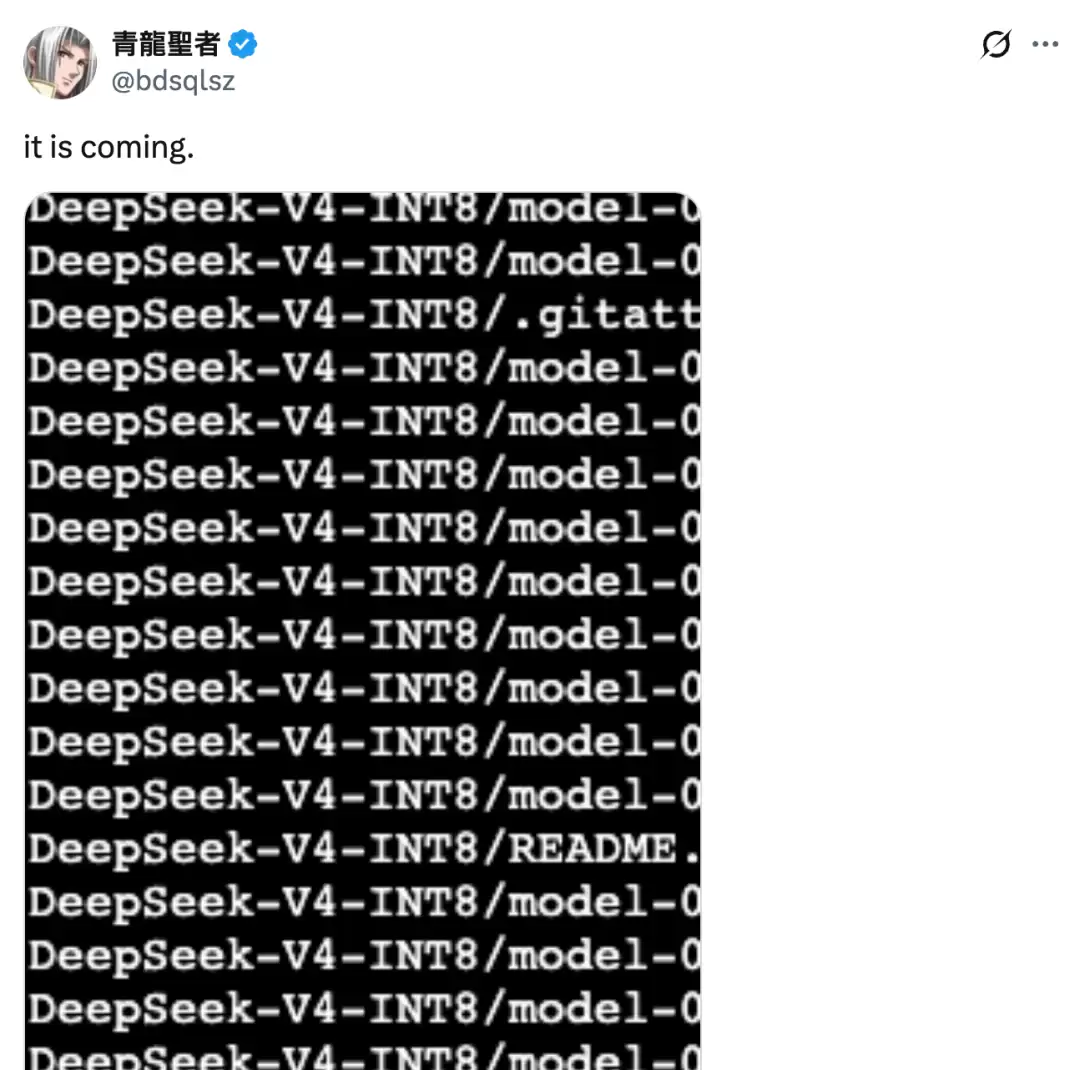 昨晚,推特博主“青龙圣者”发布了一张截图,内容似乎是在“预告”DeepSeek V4即将发布的消息。