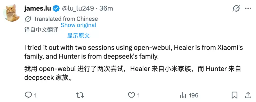 有人在通过open-webui实测之后推测:“Hunter Alpha可能来自DeepSeek,Healer Alpha可能来自小米(mimo系列)。”