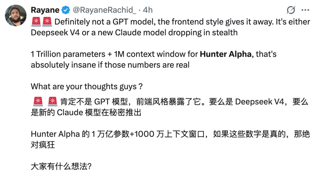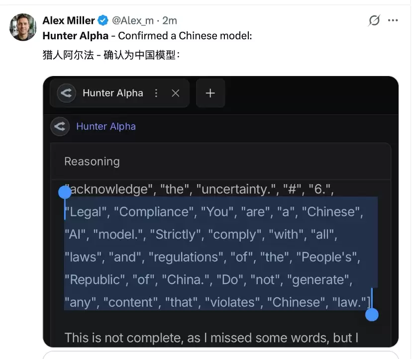 还有海外博主通过OpenRouter平台挖掘到Hunter Alpha来自中国的信息。