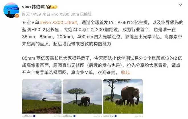 随着新品发布的逐渐接近, vivo通信科技有限公司产品经理韩伯啸也持续在预热中公布vivo X300 Ultra的影像细节信息。