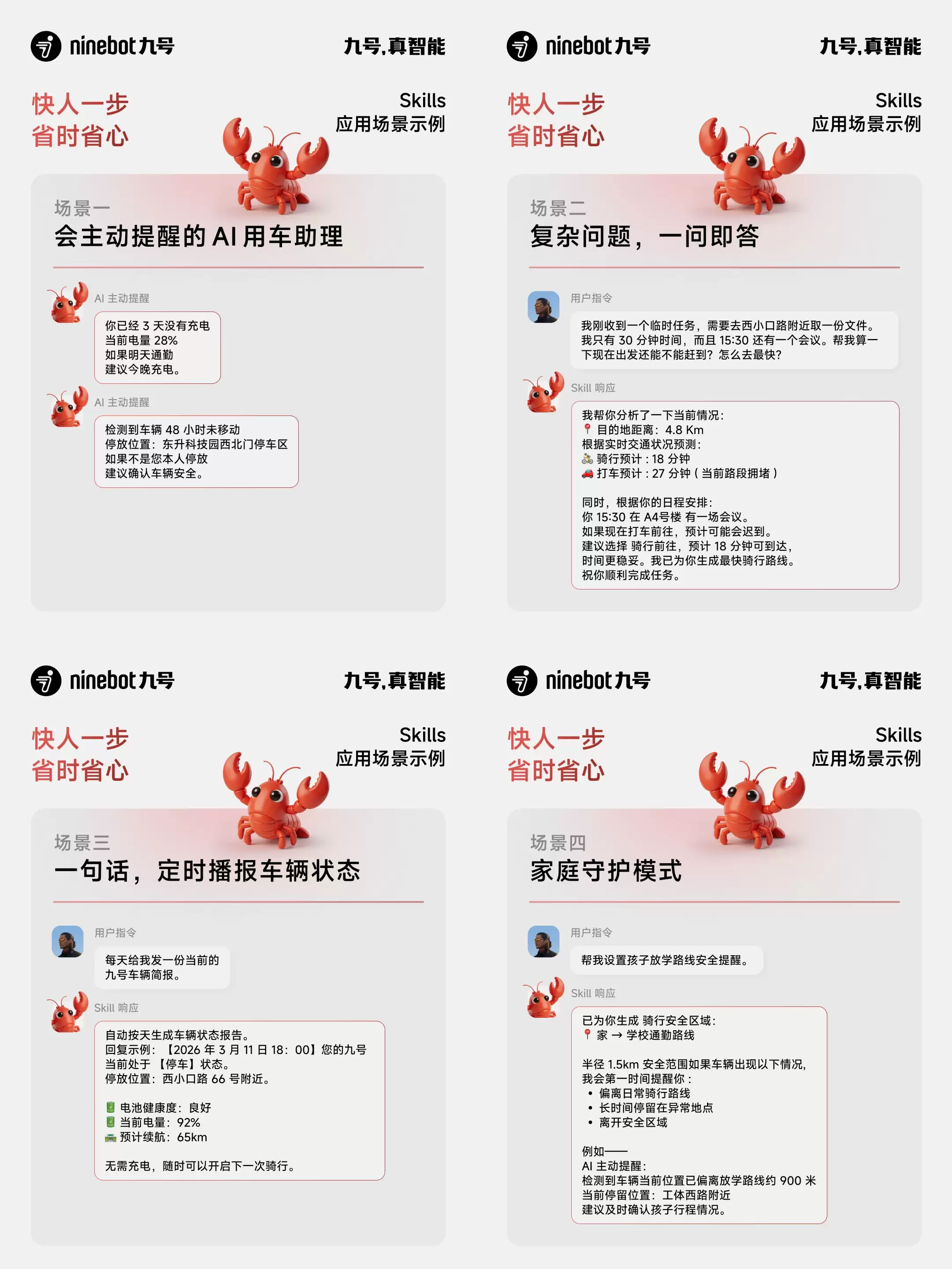 而在 AI 智能体体系下,交互方式正在发生改变。通过九号发布的设备技能,AI 在获得授权后可以读取车辆信息,并基于数据提供分析、提醒与决策辅助。用户不再需要频繁打开 App,而是可以直接通过自然语言与车辆进行交流。