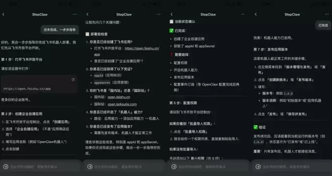 我起了一个 StepClaw 新号,告诉它我要对接飞书机器人(之前我并未配置过)。