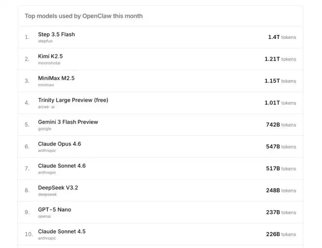 这说明一件事:在 OpenClaw 的生态里,谁的模型成为默认选择,谁就吃到最大的增长。