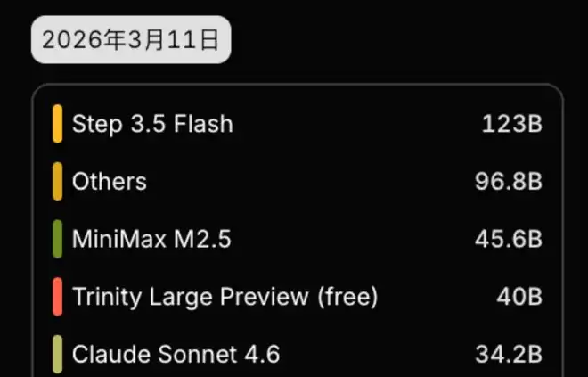 这是 OpenRouter 上 OpenClaw 后端模型的使用量排名,在过去一个月时间里,Step 3.5 Flash 连续登顶小龙虾调用量日榜,同时也稳稳拿住月榜头把交椅:
