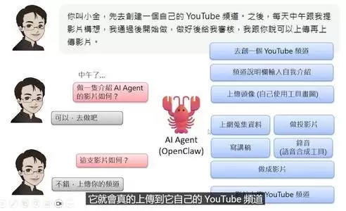 简单来说,OpenClaw是一个AI Agent框架,你可以把它理解成一个24小时住在你电脑里的“个人助理”。你可以在WhatsApp上给它发消息:“你叫小金,帮我创个YouTube频道,每天中午想个选题,做好视频自己上传。”然后,它就真的会去做。而一般常用的语言模型却只能提供一些建议和构想,无法自行创建频道 。